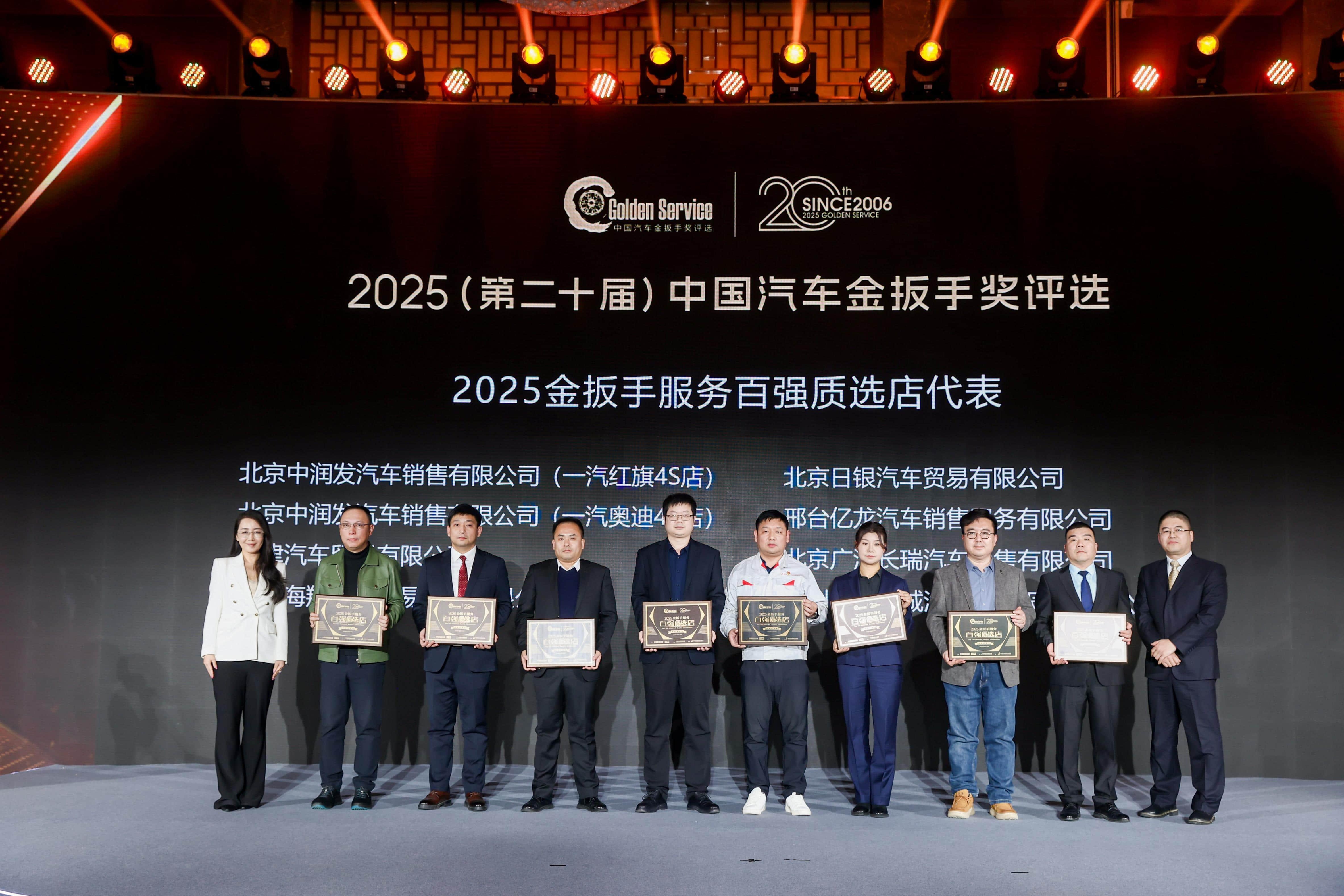 为了树立品牌服务标杆榜样,助力产业服务水平整体提升,主办方同期举办了2025金扳手服务百强质选店评选活动,该评选依据金扳手GES-150服务评价标准和《放心汽修认证》团体标准,对候选经销商进行专业评审,最终共有8个品牌的全国100家优秀经销商获得“2025金扳手服务百强质选店”荣誉称号。