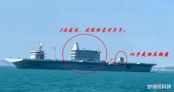 该舰只的造型还有很多奇怪的地方,比如中间的舰岛部分,造的有大又高,目测有五层楼那么高。
