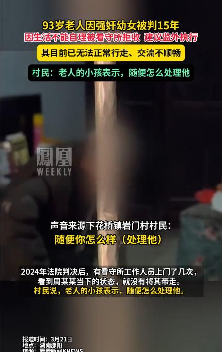 咱们先来掰扯掰扯这起"魔幻现实主义"案件。2022年案发时,91岁的周某某在自己家对同村留守女童下手。按刑法规定,强奸未成年要从重处罚,这才有了15年顶格判决。可等到要收监时,看守所突然发现这老头"生活不能自理"了——现在连走路都要挪板凳,说话都说不利索。