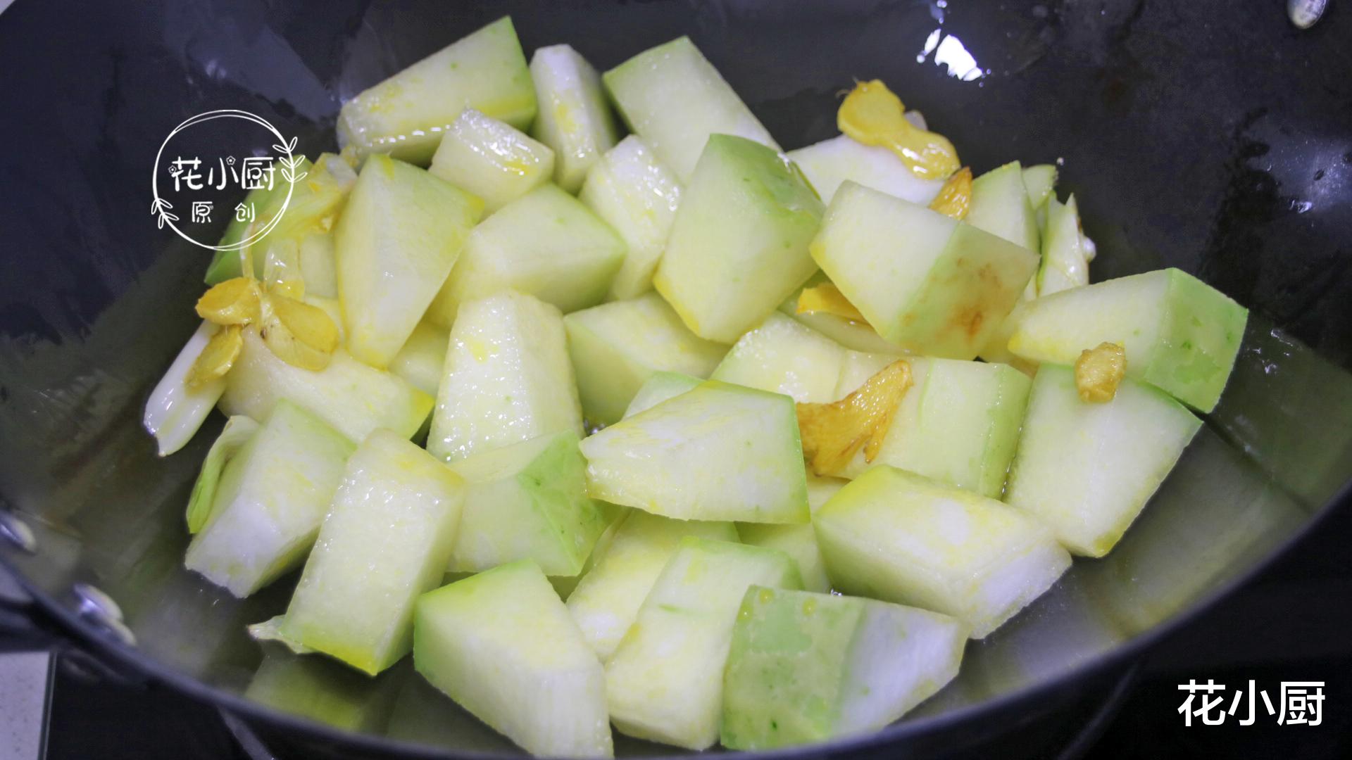 第四步:锅中加入少许的油,油热后下入葱姜片,炒出香味,然后下入冬瓜煸炒,翻炒至冬瓜表面呈现透亮状就可以了,