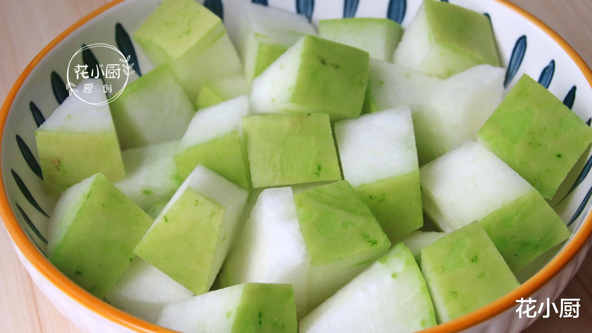第二步:接下来准备一块冬瓜,不用直接去皮,只需要用刀刮掉表皮就可以,这样保留一层绿皮部分煮出来颜色更好看,而且不容易煮烂,去皮后改刀去除瓜瓤,再切成小块;
