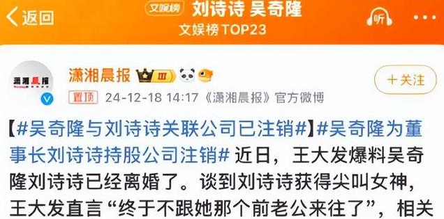 12月18日,娱乐圈内一则重磅消息炸开了锅,知名制作人王大发在社交平台爆料,称吴奇隆与刘诗诗这对昔日恩爱夫妻早已分道扬镳,并且刘诗诗目前与吴奇隆已经彻底断了联系。