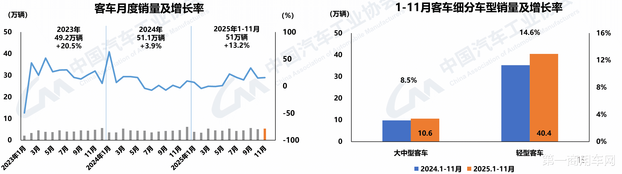 2025年1-11月,客车产销分别完成50.8万辆和51万辆,同比分别增长12.8%和13.2%。其中,大中型客车销量10.6万辆,同比增长8.5%;轻型客车销量40.4万辆,同比增长14.6%。