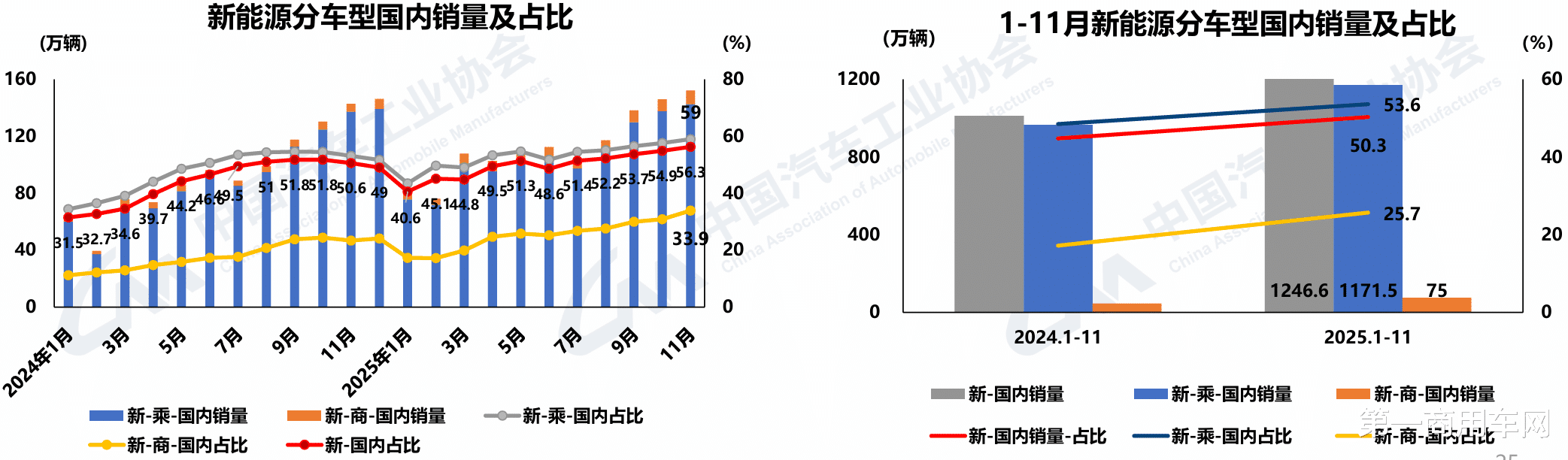2025年1-11月,新能源商用车国内销量75万辆,同比增长62.4%。新能源商用车国内销量占商用车国内销量比例为25.7%。