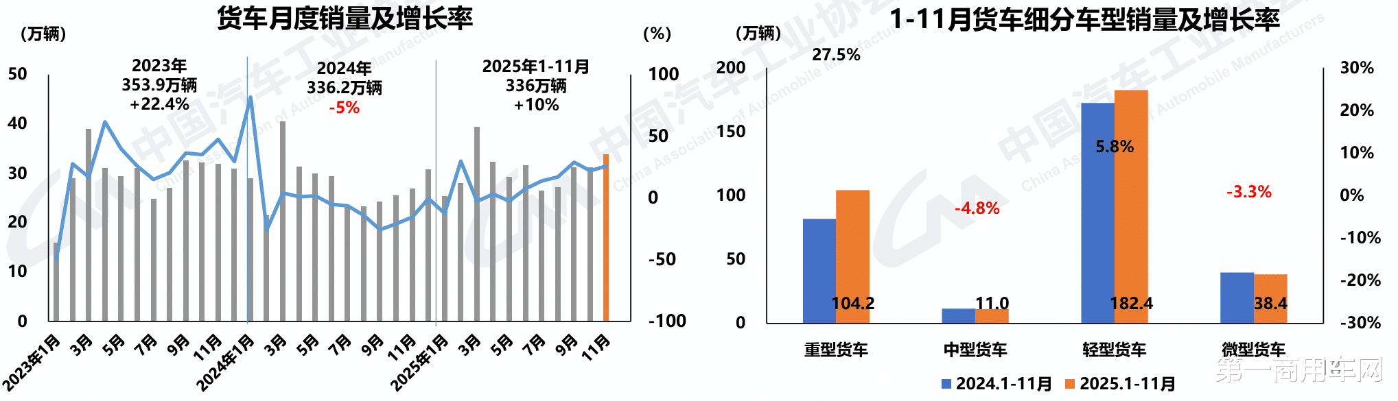 2025年1-11月,货车产销分别完成333.5万辆和336万辆,同比分别增长11.4%和10%。其中,重型货车销量104.2万辆,同比增长27.5%;中型货车销量11万辆,同比下降4.8%;轻型货车销量182.4万辆,同比增长5.8%;微型货车销量38.4万辆,同比下降3.3%。