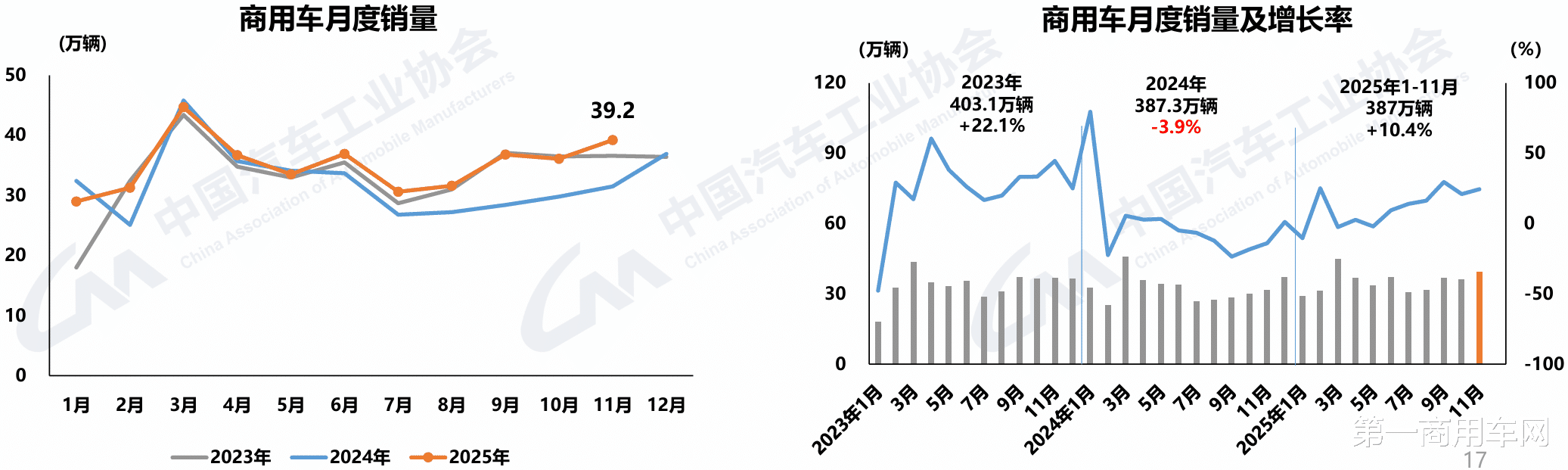 2025年1-11月,商用车国内销量292.4万辆,同比增长9.1%。其中,货车国内销量254.7万辆,同比增长8.6%;客车国内销量37.6万辆,同比增长12.7%。