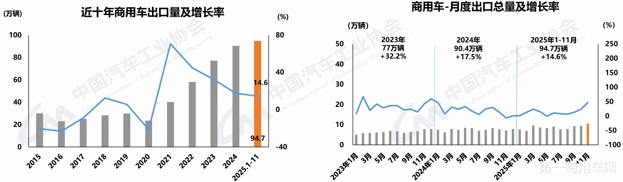 2025年1-11月,商用车出口94.7万辆,同比增长14.6%。其中,货车出口81.3万辆,同比增长14.6%;客车出口13.4万辆,同比增长14.8%。