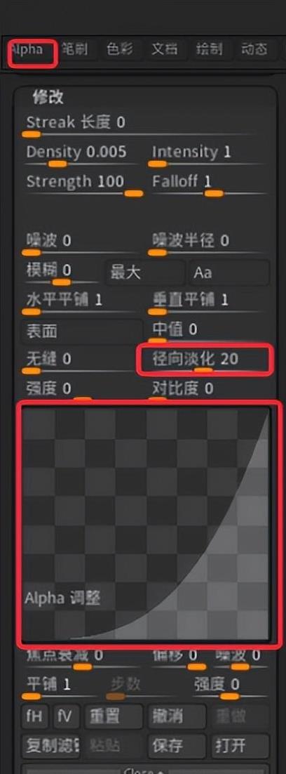 当然,有些同学可能在使用这些预制alpha笔刷的时候,喜欢使用其默认参数进行制作。但其实可以尝试一下通过调整笔刷的强弱曲线参数,包括笔触的连续方式来实现各种效果。