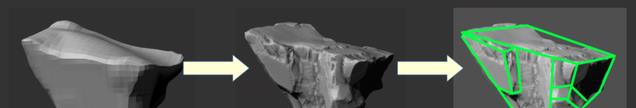 首先是体块:当我要制作一块山石的时候,首先就是要观察它的体块层次,以及分层逻辑。这一步非常重要,实践表明,如果一开始就没有处理好体块之间的比例关系以及分布排列,那么即使细节处理得再到位,结果也会是非常丑的。我们在实际制作过程中,不仅仅是要对现实进行还原,更重要的是要进行美化设计。
