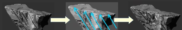 如果我们制作中遇到了需要表现出风化的感觉,类似上图中这种结构被磨圆了棱角的感觉,单靠我们手动一点一点去处理耗时又费力。我们可以使用变形工具中的特性抛光、对比度和膨胀这三个参数,去对我们雕刻的内容进行处理。