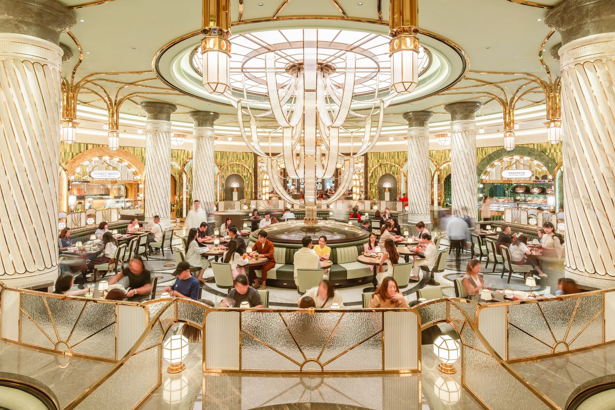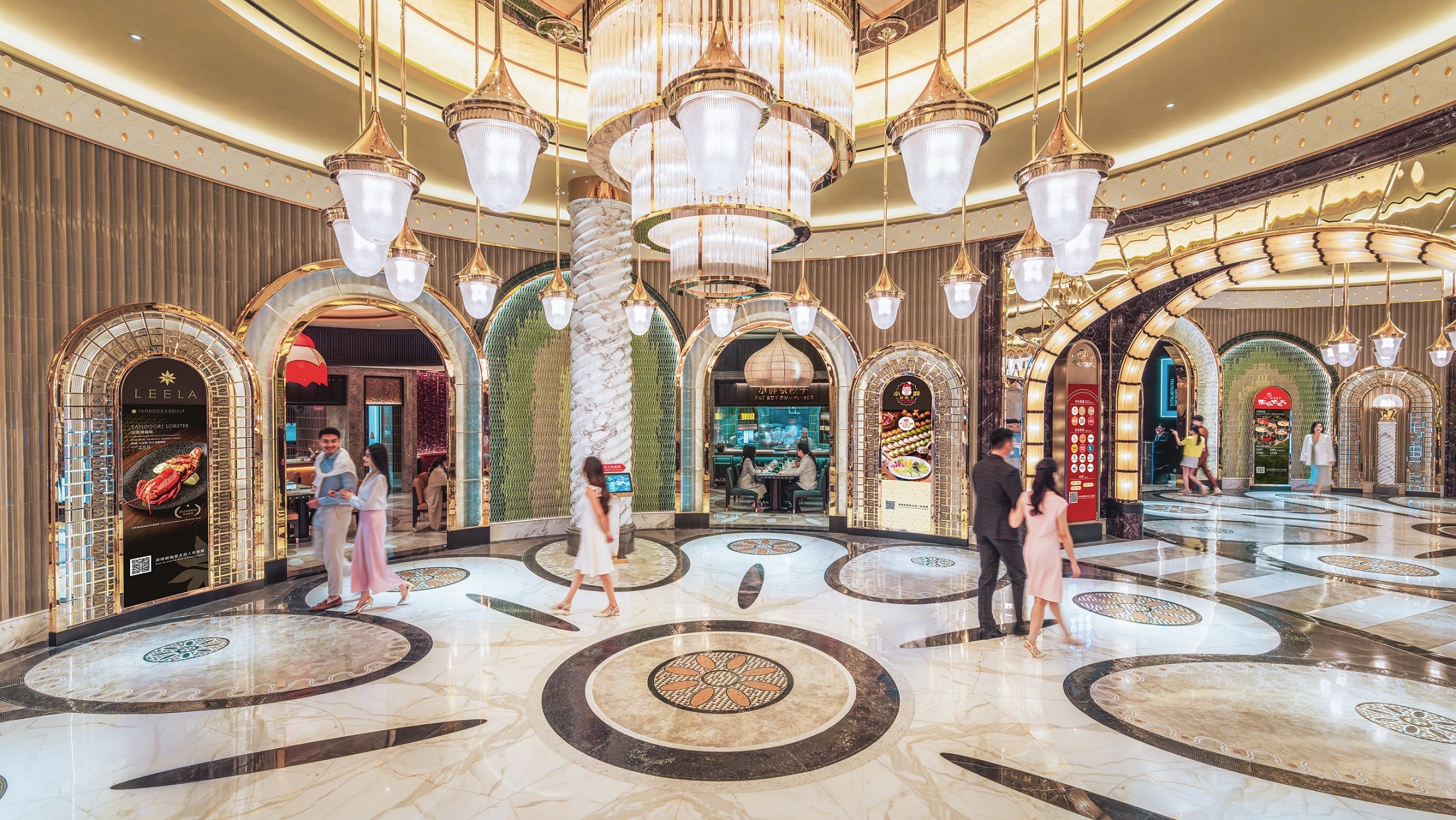 坐落于永利皇宫的馥乐庭是融汇18大顶尖亚洲餐饮品牌与永利精致美学的超人气美食地标,获奖设计由永利旗下Wynn Design and Development委托国际顶尖设计工作室David Collins Studio与Lighting Design International联袂打造。灵感源自欧洲诸多著名市集广场的美学精髓,从金碧辉煌的拱门到精美繁复的地砖,通过别出心裁的空间设计,生动诠释充满历史底蕴的经典元素,营造出极具感官冲击力的用餐氛围。作为国际合作的集大成之作,馥乐庭荟萃了全世界顶尖匠艺 —— 意大利马赛克百年世家精雕细琢的装饰拱门,完美还原了欧洲油画般的逼真质感;捷克波西米亚玻璃千年工艺典范打造的巨型吊灯,如喷泉般在美食广场璀璨绽放;美国先锋艺术家独家设计的镜面雕塑“Allsphyr”,以扭曲的镜面为拍照增添无限趣味。在美轮美奂的馥乐庭,每个角落都散发着独特的艺术气息和匠心独运的魅力。这里不仅是品味非凡的美味殿堂,更是让人流连忘返的打卡胜地。