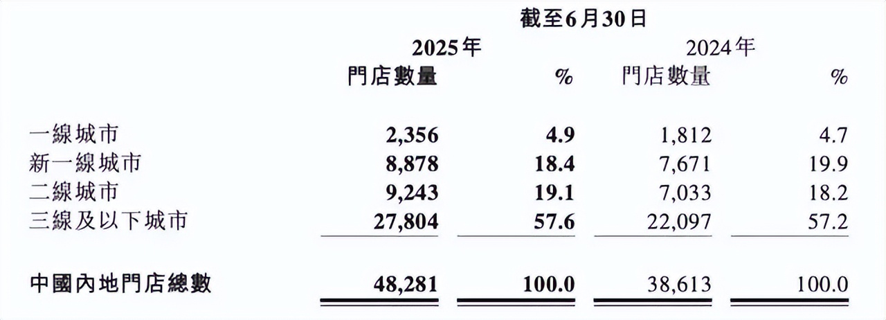 1-6月,其在中国内地缔造的网络,已超过300个地级市,扎根最牢固的,仍是三线及以下城市,占比达57.6%,比重微增0.4%。