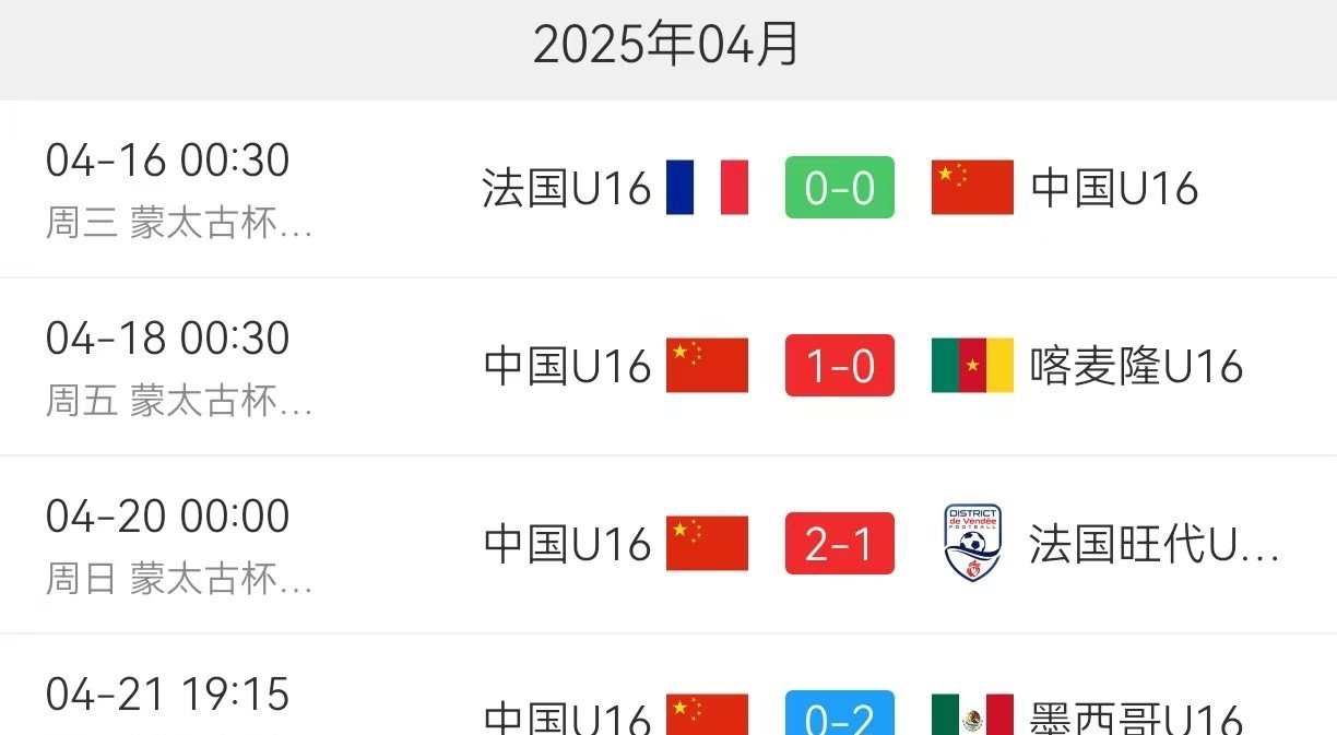 目前中国U16在日籍主帅浮嶋敏的带领刚刚在法国参加具有悠久历史的蒙太古杯,中国队先是与东道主法国战成0:0,随后在与非洲球队喀麦隆和法国旺代的比赛中都以1球小胜对手,最终在季军争夺战中2球不敌中美洲球队墨西哥。最终取得了第四名,也创造了中国球队参加该项完整的最好成绩。
