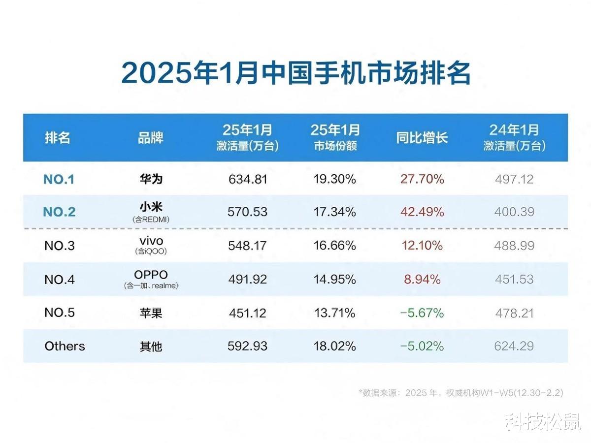 2025年1月,华为手机国内激活量高达634.81万台,市场份额高达19.3%,同比增长27.7%。毫无悬念拿下冠军。华为的市场份额比第二名的小米高出近2个百分点,激活量多出60万台。对比第五名的苹果,华为的市场份额高出5.59个百分点,激活量更是多出180多万台。2025年1月,华为手机激活量独一档,600万以上;小米和vivo处于第二档,500万以上;OPPO和苹果第三档,400万以上。