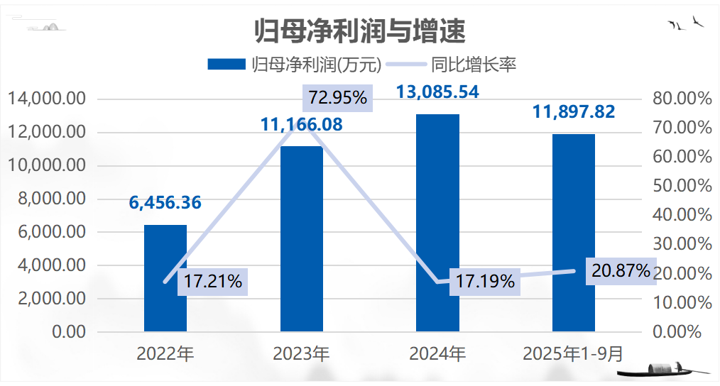2022年至2024年,公司营业收入由8.92亿元增长至10.66亿元,CAGR为9.32%;归母净利润从2020年的6456.36万元提升至13085.54万元,CAGR达42.36%。2025年前三季度,公司营收为7.14亿元,同比减少5.47%;归母净利润为11897.82万元,与上年同期相比增长20.87%。