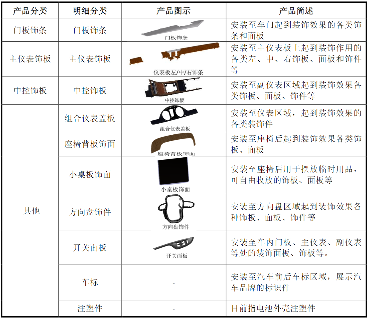 通领科技主要从事汽车内饰件的研发、生产及销售,是一家集产品研发设计、模具自主开发、产品生产及销售为一体的高新技术企业。公司的主要产品包括门板饰条、主仪表饰板、中控饰板等,主要应用于乘用车领域。