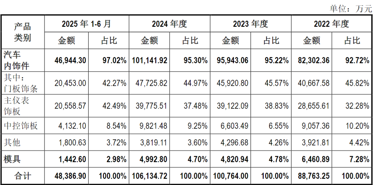 从营收结构来看,公司营收主要来自汽车内饰件产品,相关产品的主营业务收入占比分别为92.72%、95.22%、95.30%和97.02%,呈逐年增长的趋势。