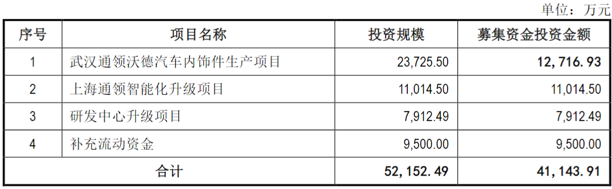 本次IPO拟募集资金4.11亿元用于武汉通领沃德汽车内饰件生产项目、上海通领智能化升级项目、研发中心升级项目和补充流动资金。
