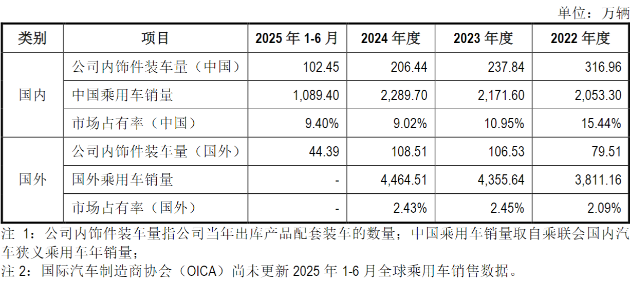 2022年至2025年H1,公司内饰件中国市场的占有率分别为15.44%、10.95%、9.02%及9.40%,最近三年国外市场占有率分别为2.09%、2.45%、2.43%,在行业内饰企业从业者众多且充分竞争的情况下,拥有相对较高的市场占有率。在国内整车厂竞争愈加激烈的情况下,公司积极调整经营战略,在稳定现有客户合作关系的基础上,不断深耕海外客户资源,2023年度海外销售金额及收入占比大幅增长,海外市场占有率有所增长,2024年度公司海外市场占有率与2023年度基本持平。