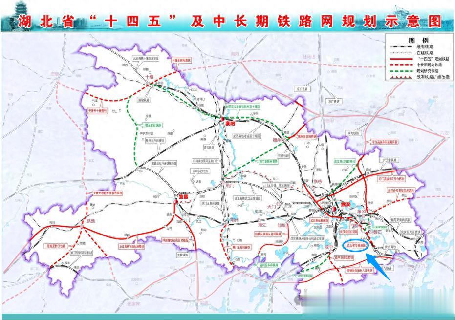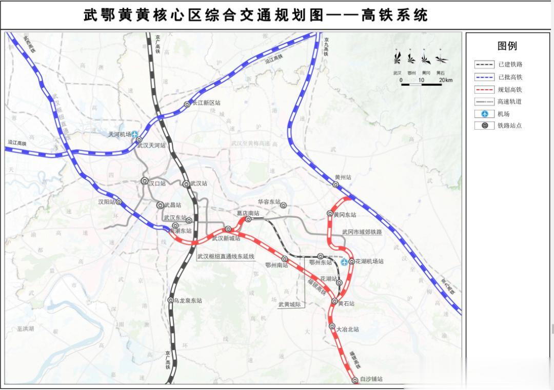 在近期开工建设已规项目的基础上,规划新增武汉枢纽直通线东延线(南湖东—葛店南),在武黄高速南侧设武汉新城站,通过既有武冈城际,接入京九西通道。