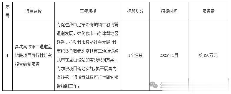 2025年12月25日,盘锦市交通运输局发布了《秦沈高铁第二通道盘锦段项目可行性研究报告编制服务招标预公告》,拟在2026年1月启动前期研究招标,招标预算180万元。公告显示:为促进我市辽宁沿海城镇带渤海翼通道发展,强化我市与京津冀地区联系,拉动我市经济社会发展,我市积极争取秦沈高铁第二通道途经我市在盘山设站的南线规划方案。为加快项目落地实施,拟开展秦沈高铁第二通道盘锦段可行性研究报告编制工作。