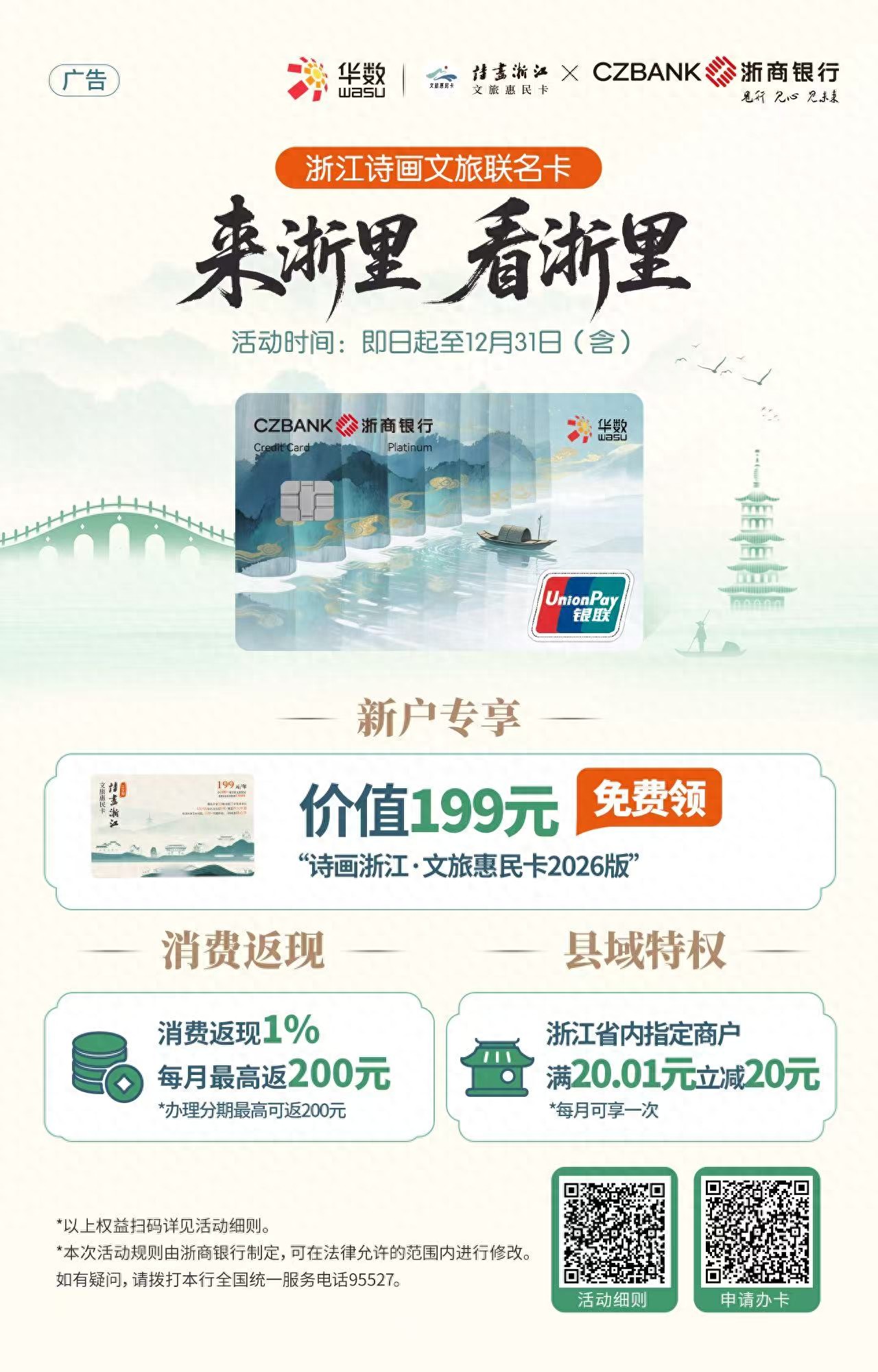 据悉,此次推出的“诗画浙江文旅(浙商)联名卡”是浙商银行携手华数传媒网络有限公司联合发行的,属于银联白金信用卡。持卡人可享有“‘诗画浙江’文旅惠民卡”“浙商银行消费返现”“指定文旅商户消费立减”三重权益:一是新客户成功办卡并完成首刷,即可免费领取“文旅惠民卡2026版”,可在浙江省内11个地市120余个景区享受‘吃、住、行、游、购、娱’全链条的优惠权益;二是使用该信用卡在支付宝、微信等各个渠道消费,可按1%比例累计微信立减金,最高可享受200元/月的返现;三是在浙江省内指定商户消费,还可享受“满20.01立减20元”的优惠活动。