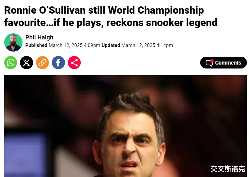 英媒《地铁报》:“斯诺克传奇评价,如果奥沙利文参赛,依然是世锦赛的夺冠热门”。这篇主要是对斯诺克传奇球员丹尼斯-泰勒的采访。几个要点: