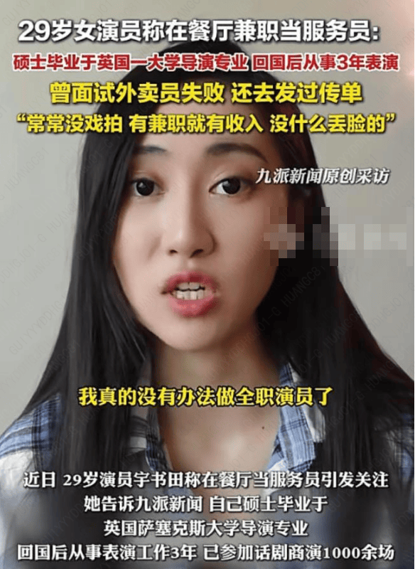 在繁华都市的喧嚣中,一位 29 岁的女演员正悄然书写着属于自己的独特篇章。她叫宇书田,一个在演艺道路上执着前行的追梦人,近日因在餐厅兼职当服务员引发大众热议,而她的回应,如同一束光,照亮了无数人心中关于梦想与现实的困惑角落。