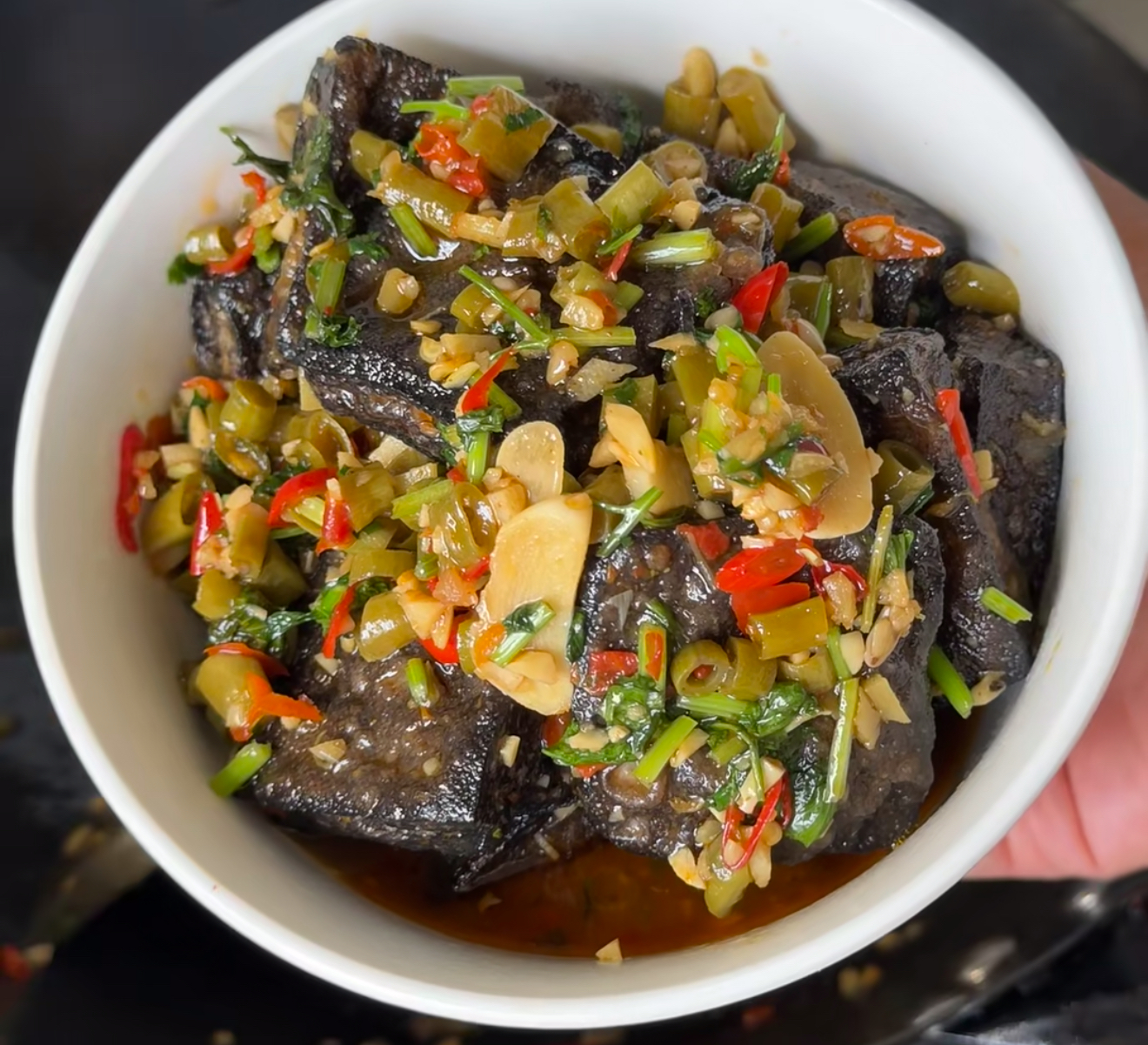 4. 灵魂酱汁:蒜末+小米辣+白芝麻淋热油激香,倒入调好的酱汁煮沸。最后撒把香菜碎,这抹翠绿是臭豆腐的时尚配饰。