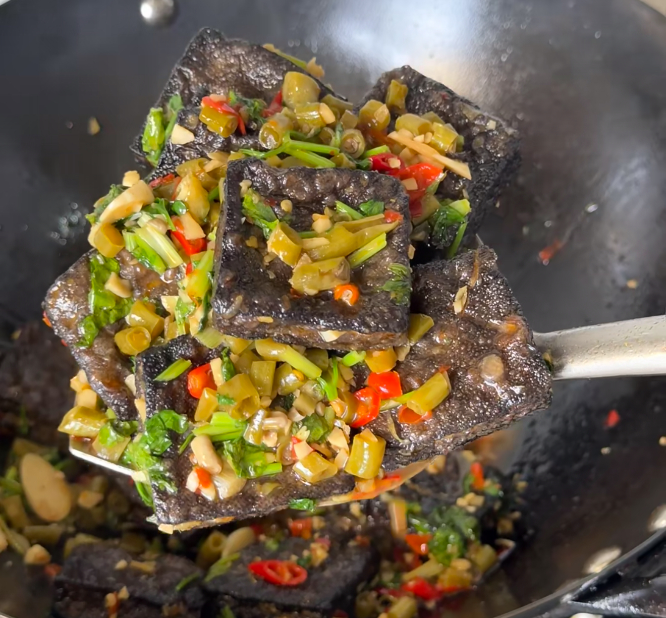 3. 黄金时刻:转中火升至180℃,复炸2分钟至表皮酥脆。看着墨色豆腐在油锅里膨胀成小方船,表面冒出细密气泡,就像给豆腐做了场美黑SPA。