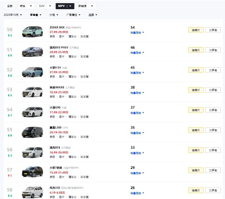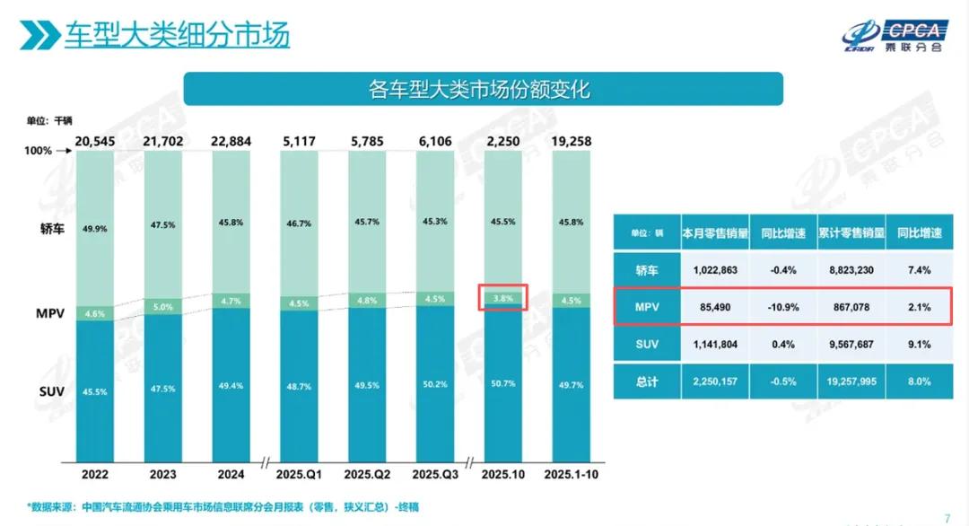 根据乘联会数据,2025年1-10月MPV累计零售仅86.7万辆,同比仅增2.1%。10月MPV的市场份额更是跌至3.8%,不足SUV市场的十分之一。