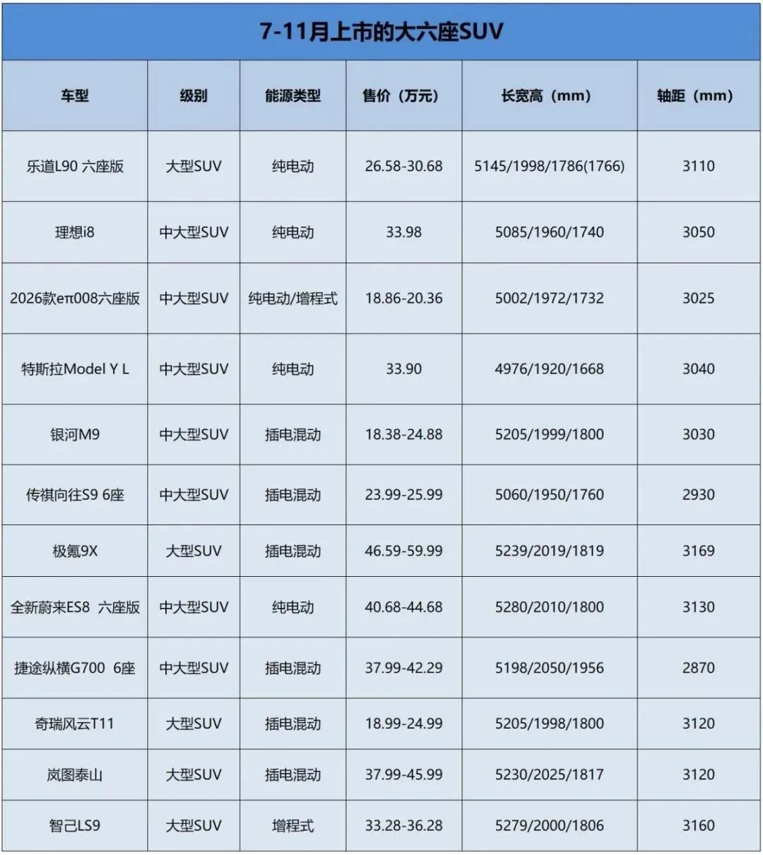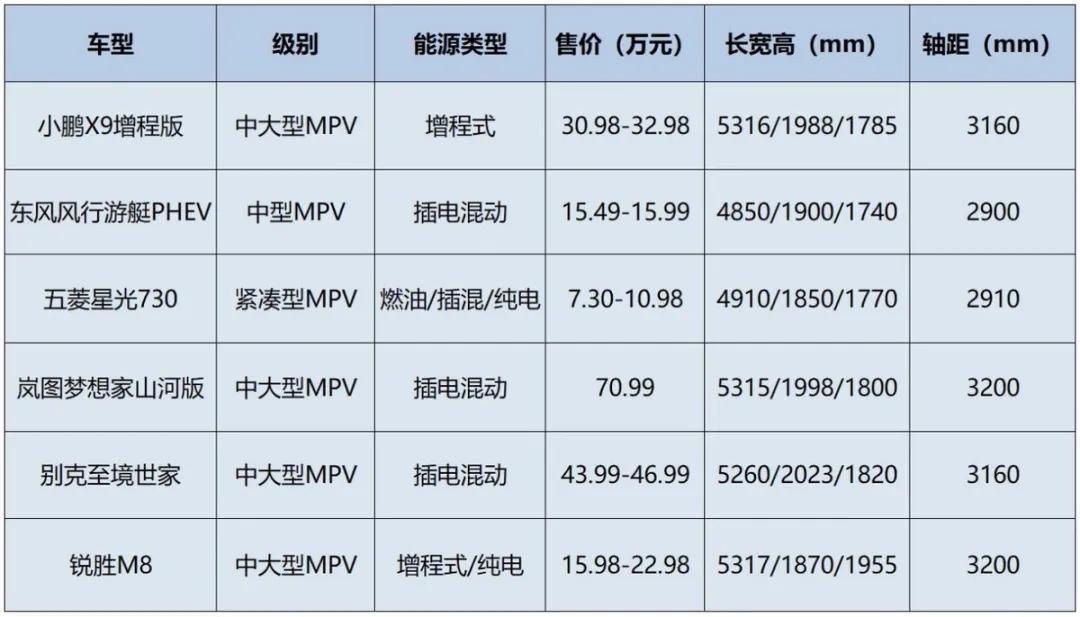 不止这三款MPV,当下的MPV市场已然呈现出“密集上新”的态势。仅从2025年11月至今,就有6款MPV上市了,价格覆盖7万~80万元,动力形式涵盖燃油、插混、增程及纯电。