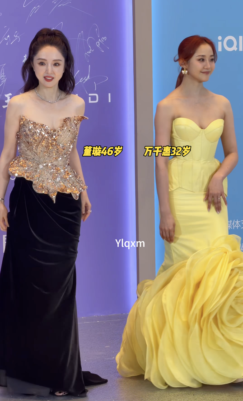 再看万千惠染了一个酒红色的发色,穿了一条明黄色的礼服,肤色被衬得更黝黑,比董璇暗了几个色度。