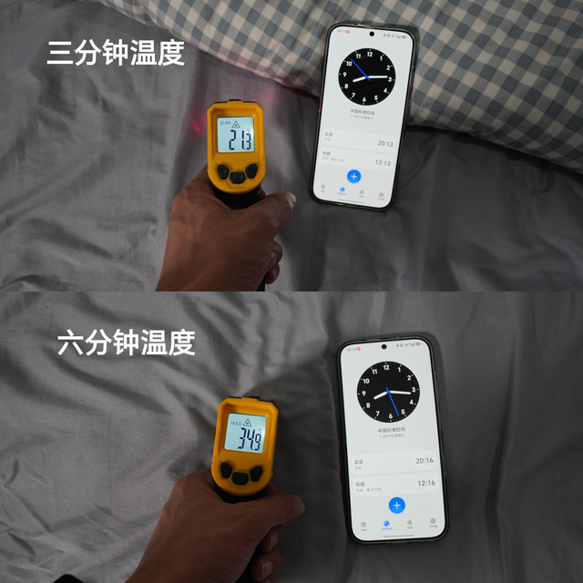 实测结果也很直观:开启后3分钟,床面整体就超过21.3℃,6分钟时达到了34.9℃。实际使用时的感受则比这些数据来的更直观一些,盖住被子的地方几乎短短的几分钟就有了整体温暖感,而且不是先热脚后热头那种局部发烫。