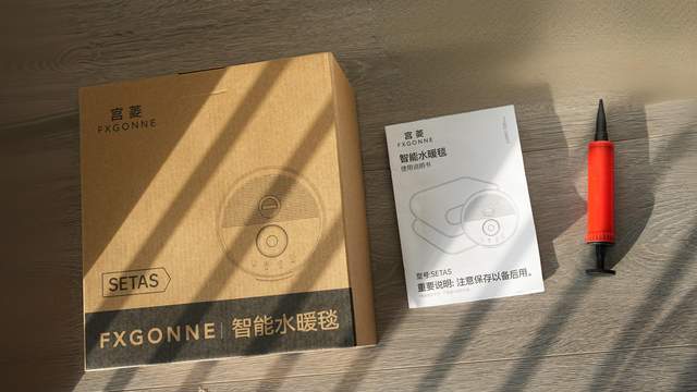首先先开箱跟大家简单介绍一下水暖毯的配件和与传统电热毯的不同。宫菱水暖毯有一个主机,一个1.8*2米的水暖毯,配套的遥控器、还有一个收纳用的打气筒。打气筒是用来在收纳时对准一个口打气来排出毯子里面的水。