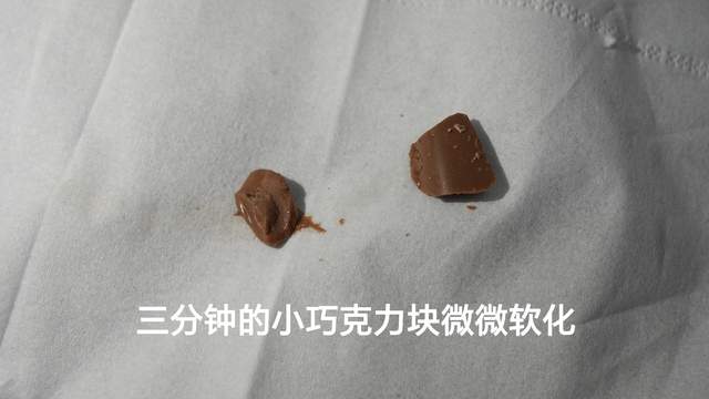 巧克力的实验也印证了这一点:放在毛毯中心位置在3分钟左右开始明显软化,表面细小的地方开始有油光。
