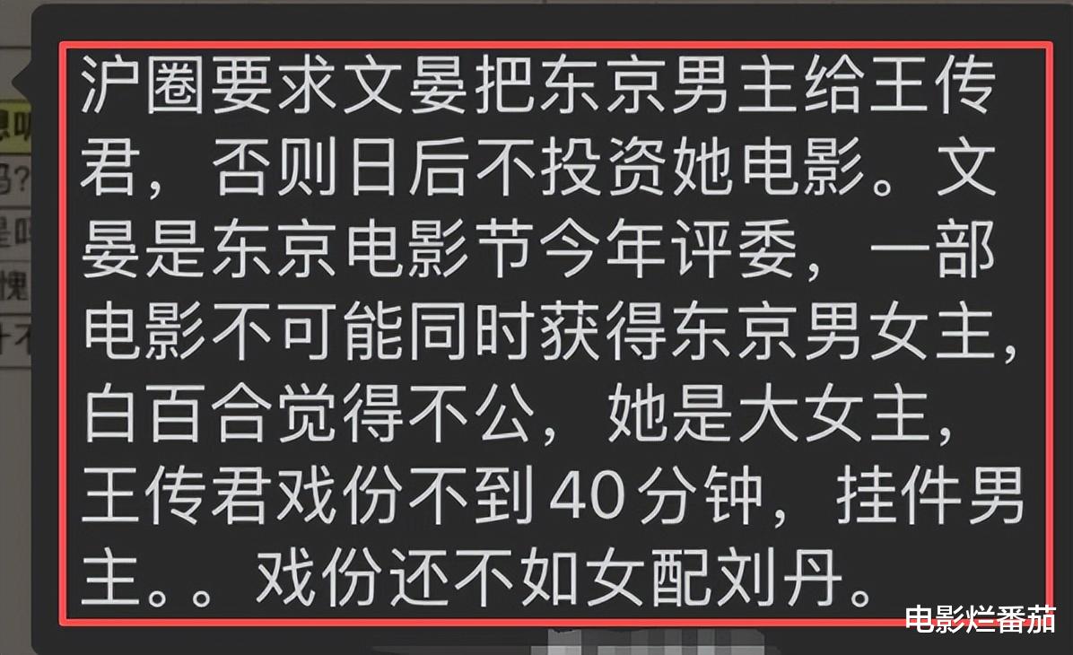 前面我们也说了,有小道消息称,“沪圈要求文晏将奖颁给王传君,否则不给她的电影投资”。
