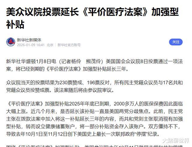 先说这个230比196的。这事是众议院投的,关系到好多美国老百姓的医保。有个补贴快到期了,要是没了,很多人每个月看病就要多花不少钱,这对普通家庭来说不是小事。