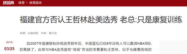 环球网 2016-03-25福建官方否认王哲林赴美选秀 老总:只是康复训练