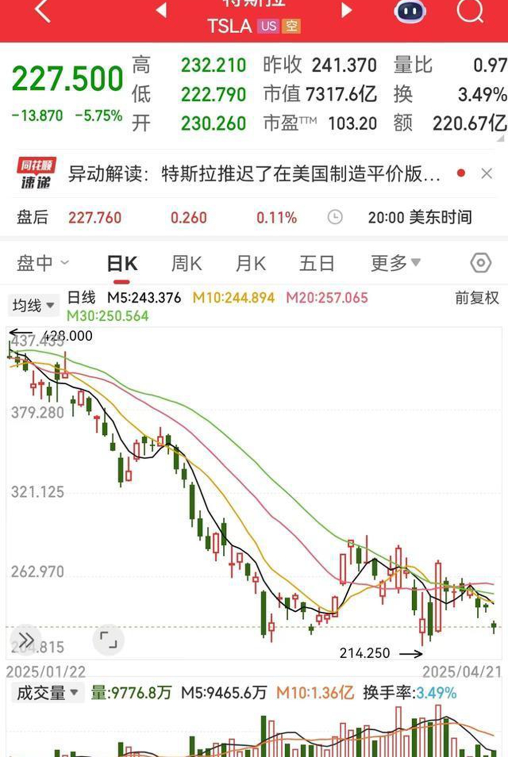对了,本周特斯拉还要公布最新财报,我估计很多人都在等着看呢。截至当地时间 4 月 21 日收盘,特斯拉报 227.5 美元,跌幅 5.75%,市值 7317.6 亿美元。这一连串的消息,就像一颗颗重磅炸弹,把曾经那个高不可攀的特斯拉形象炸得有些支离破碎。