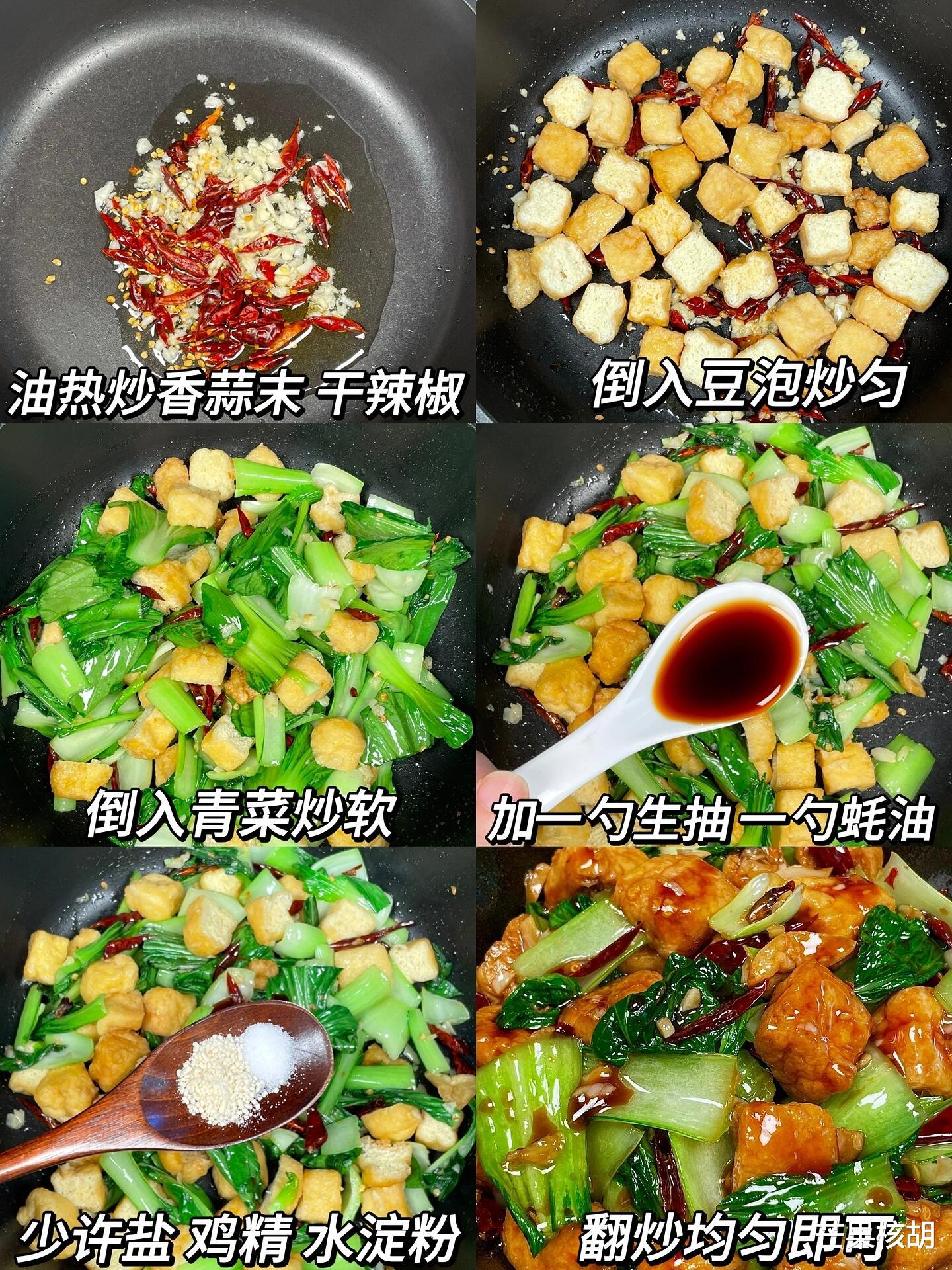 等蒜末和干辣椒炒出香味后,把豆泡倒进去。用铲子翻炒均匀,让豆泡在锅里尽情吸收刚才爆香的味道。豆泡表面金黄,一个个在锅里蹦跶,看着就诱人。翻炒一会儿,你会发现豆泡变得更有光泽了,这时候它已经准备好迎接青菜啦。