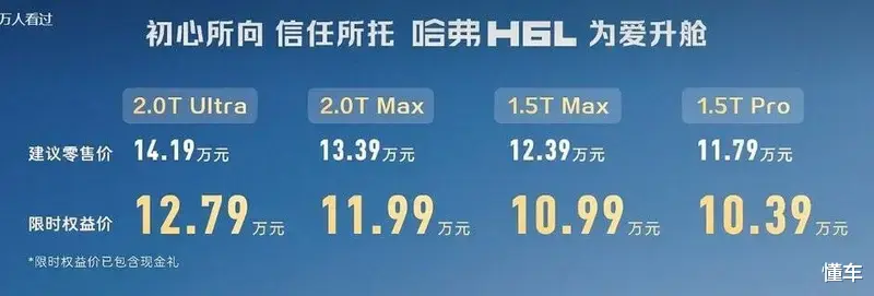 此次哈弗H6L共推出四款配置车型,分别为2.0T Ultra版、2.0T Max版、1.5T Max版及1.5T Pro版,官方限时权益价低至10.39万元,精准覆盖主流家用车预算区间。