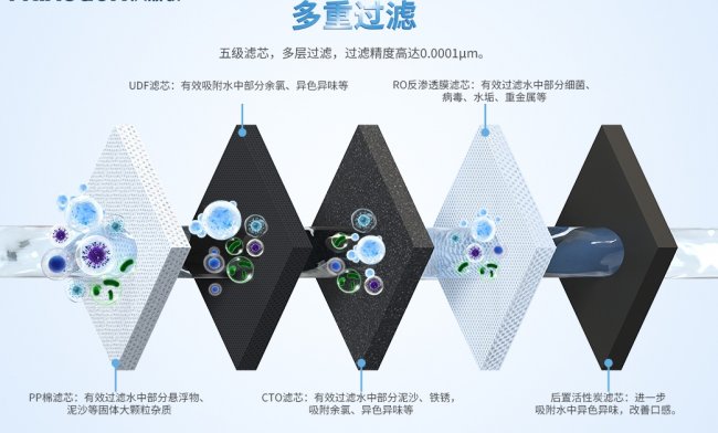 1. 双RO膜协同过滤:两支RO膜同步运行,总过滤面积较单膜机型扩大一倍,可高效拦截水中99.9%的重金属、细菌、病毒及微塑料等有害物质,同时降低单膜负荷,延长滤芯寿命至18-24个月(视水质而定)。