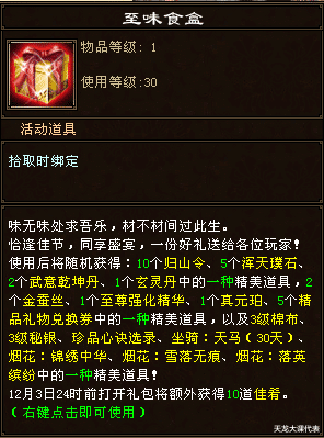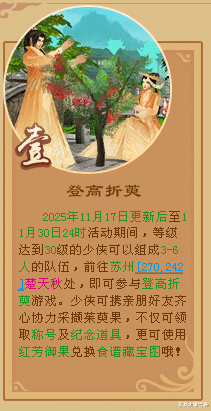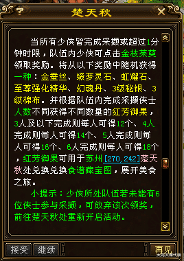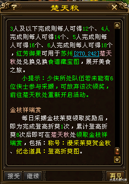 2.每天组队种茱萸采果实拿活动道具。每次完成随机抽奖,里头有3级秘棉布、幻魂丹和至尊强化精华。累计完成8次有称号和纪念道具。