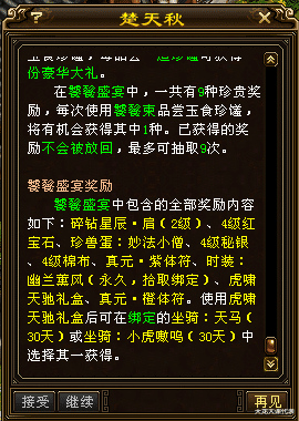 5.大奖奖池。拿前面的饕餮柬抽,有上个普通池保底的两张。主要奖励是4级宝石、4级棉布秘银、真元橙体符、碎钻星辰・肩(2 级)、永久时装幽兰薰风等。不重复抽取,各凭运气吧。