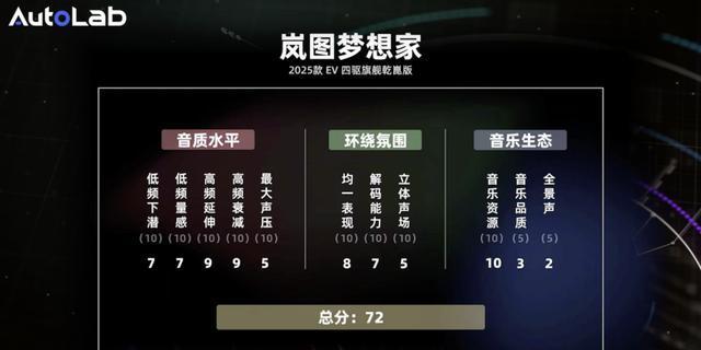最终,我们实际测试后,岚图梦想家在AudioLab 2.0的打分体系里拿到了72分的总成绩。