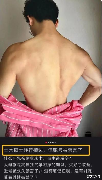 所以这位李同学一气之下脱下长衫“下海”,利用自己身材好的优势搞擦边,只发了一篇预告就引来了1.1万人围观,只能说不亏是名校研究生,学习精神非常足,前期准备做的很充分,从工具到动作都学习了一遍。结果因为预热太高调被平台封了,也算是创业未半崩殂。