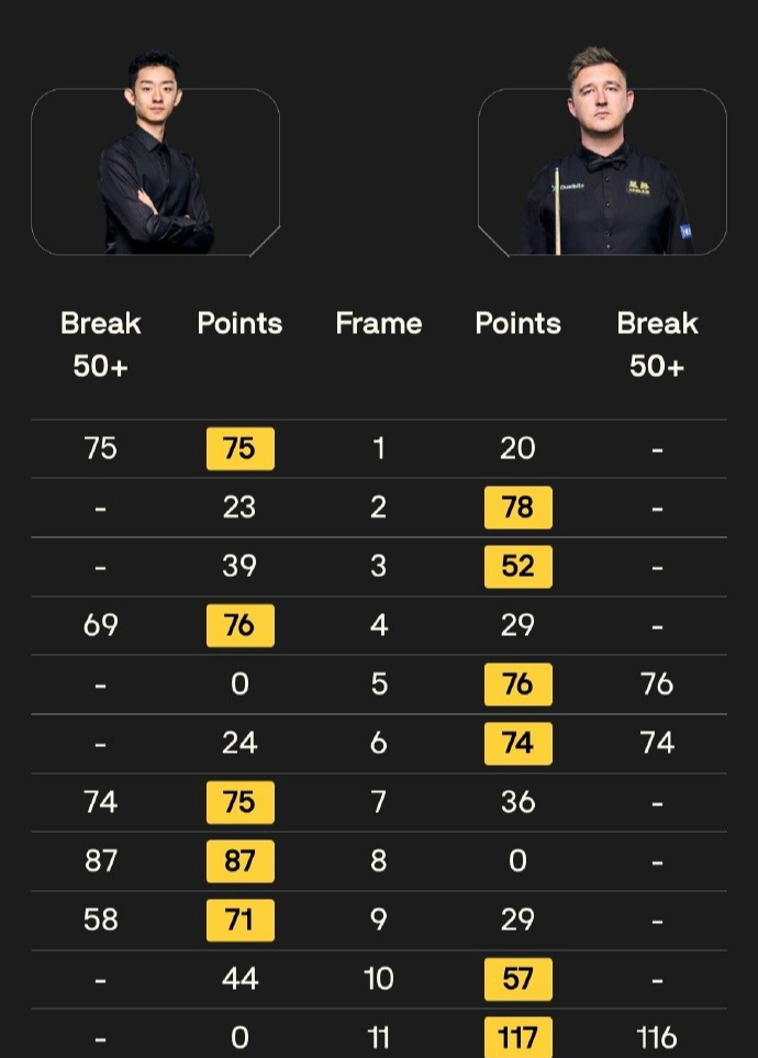 接下来的第9局,多次上手,希金斯63-43分按下。第十局,希金斯打出来了单杆70分,以79-40的比分赢下比赛。第十一局,老张打出来了单杆57分,以72-18的比分赢下比赛。