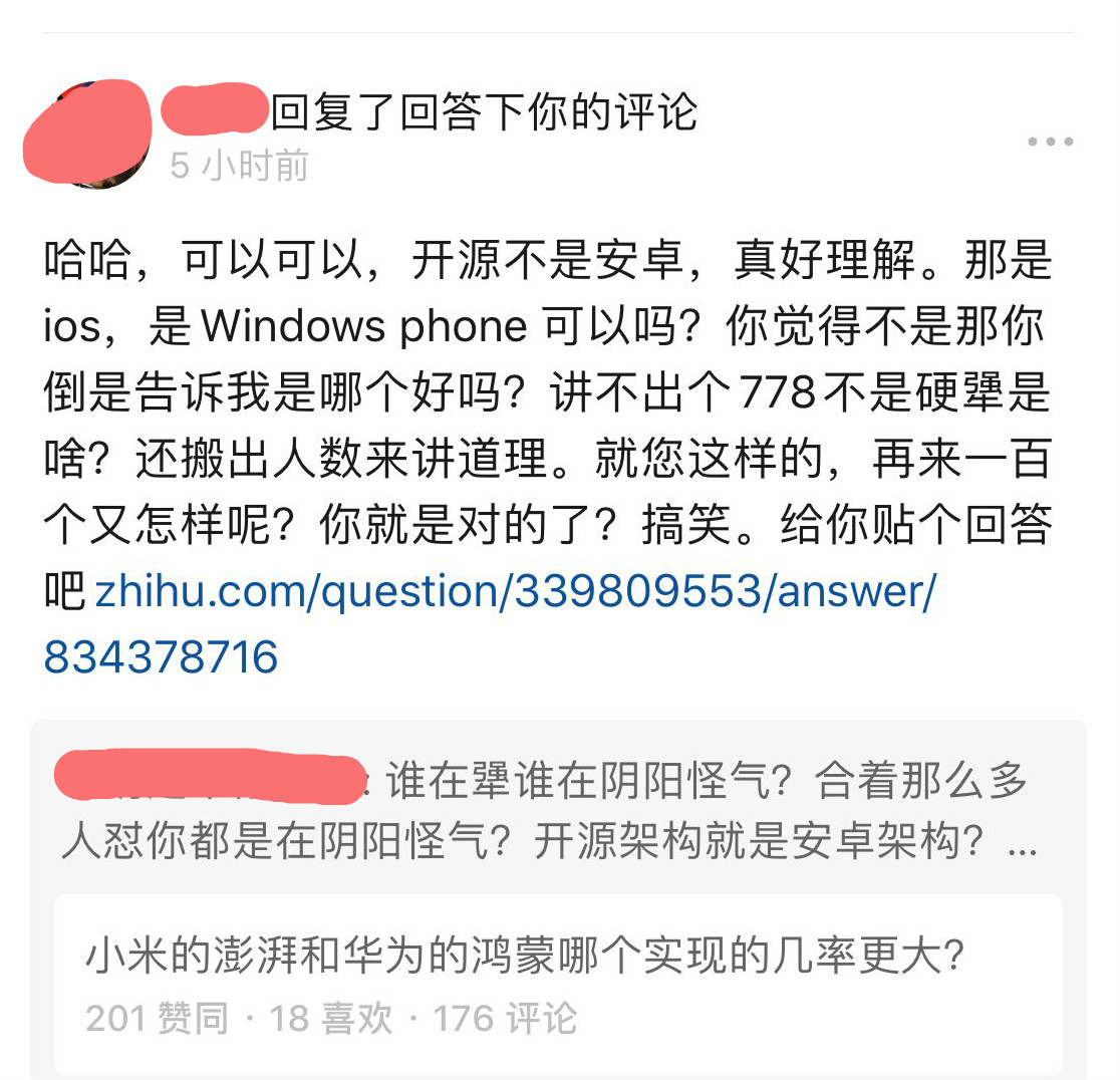 众所周知,目前比较有名的信息交互平台微博、贴吧、知乎,在涉及到专业领域的问答互动上,知乎的有效答案是相较于其他几家是比较多的,也是比较具有专业性的。但是笔者近日浏览知乎推送问答:《小米的澎湃和华为的鸿蒙哪个实现几率更大?》时,在浏览所有回答中与某个答主产生了意见分歧。他说华为说的鸿蒙是基于开源框架编写的,开源框架=安卓,所以鸿蒙是安卓魔改系统。我指正安卓鸿蒙皆是基于linux编写,他立马给我扣上海军帽子。。。