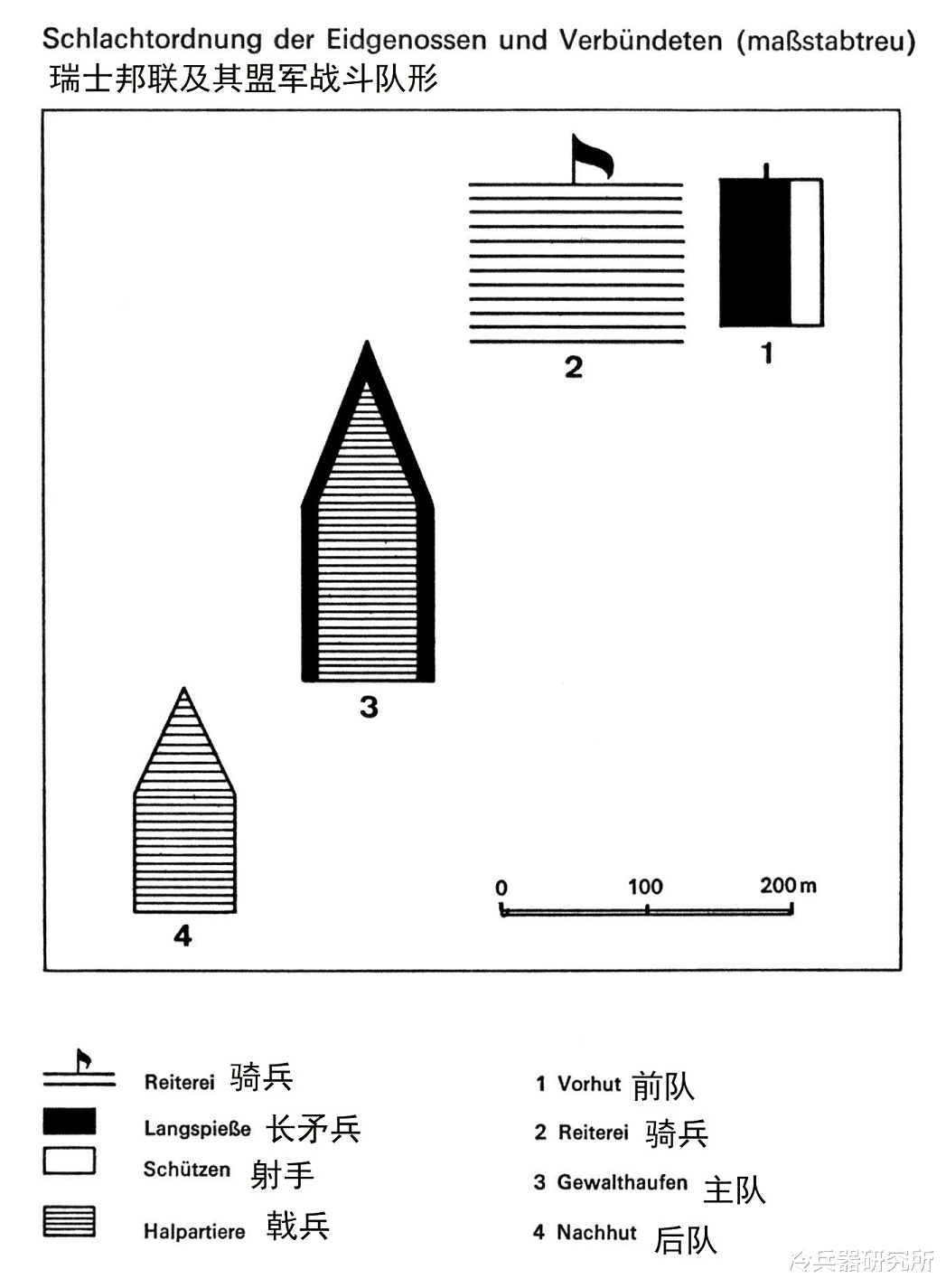 正如黑内书中的绘图所示,与传统印象中长枪如林的马其顿方阵、继业者方阵不同,瑞士“战队”更像是以戟兵为核心,外围包裹寥寥几列长矛兵的混合兵种队形,甚至时常形成楔形(Keil、Spitz)而非方形的战斗队形。